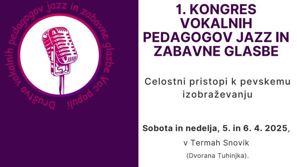 Vabimo vas na 1. kongres vokalnih pedagogov jazz in zabavne glasbe, ki bo v soboto in nedeljo, 5. in 6. 4. 2025, v Dvorani Tuhinjka, v Termah Snovik. Vabljeni vsi zainteresirani, ne glede na glasbeno izobrazbo, stilistično usmerjenost in izkušnje. Organizator kongresa je Društvo vokalnih pedagogov jazz in zabavne glasbe Voc populi.