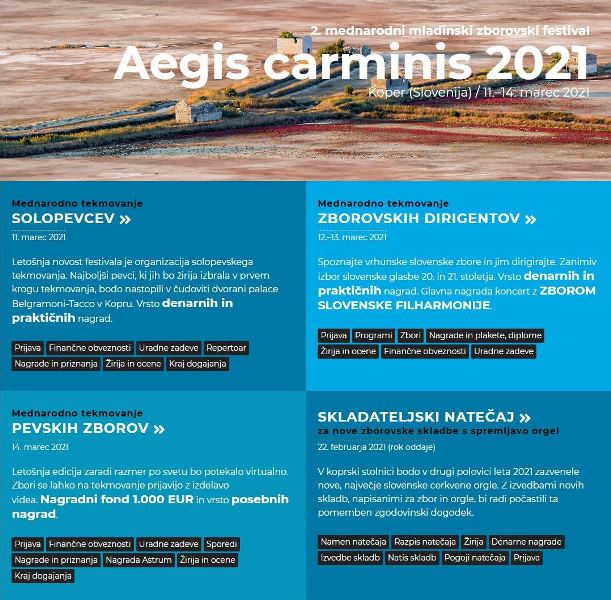 Po uspešni prvi izvedbi v letu 2019 se letos kljub številnim omejitvam v prilagojenih oblikah od 11. do 14. marca 2021 v Kopru in na spletu bienalno nadaljuje 2. mednarodni mladinski zborovski festival Aegis carminis 2021.