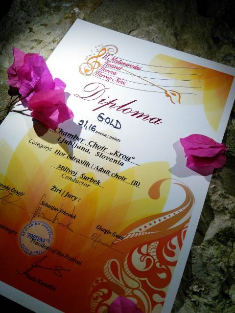 Komorni zbor KROG, Ljubljana, dir. Milivoj Šurbek: zlata plaketa in 1. mesto v kategoriji odraslih zborov ter skupno 2. mesto med vsemi zbori na tekmovanju.
