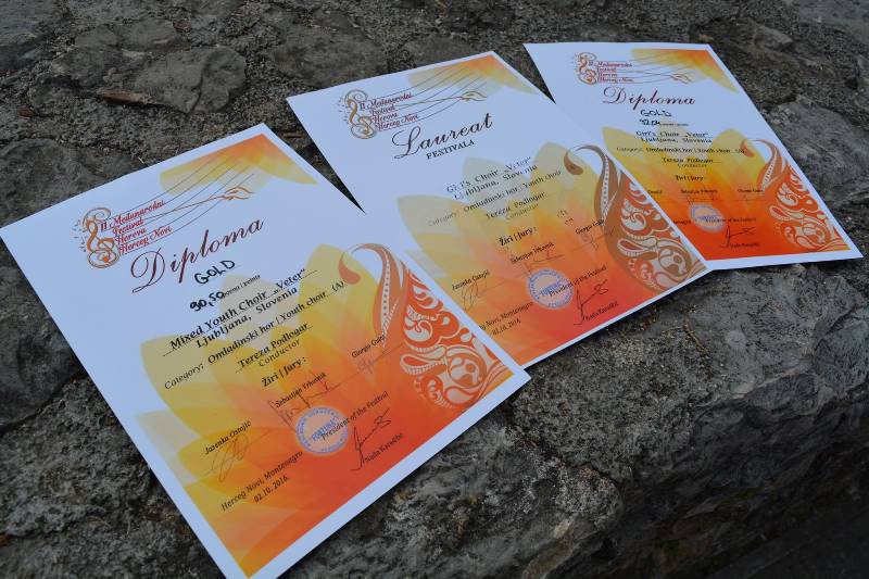 MeMPZ Veter, zb. Tereza Podlogar (zbor ljubljanskih srednješolcev, ki deluje pri Glasbeni mladini ljubljanski): dve zlati plaketi v kategoriji otroških in mladinskih zborov – 1. mesto dekliške zasedbe in 3. mesto mešane zasedbe. Dekliški zbor Veter je postal tudi najboljši zbor (lavreat) tekmovanja.