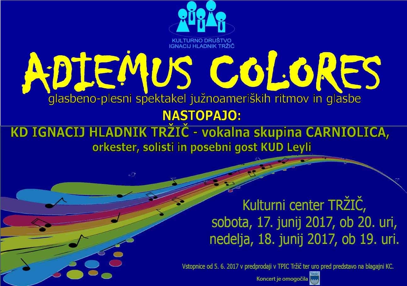 Kulturno društvo Ignacij Hladnik Tržič ne počiva. Po uspešni izvedbi operete Planinska roža, se v mesecu maju vračamo na oder Kulturnega centra Tržič. Predstavili vam bomo glasbeno-plesni spektakel južnoameriških ritmov in glasbe z naslovom ADIEMUS COLORES, skladatelja Karla Jenkinsa. Plesni del spektakla bodo kot gostje izvedle plesalke KUD Leyli iz Tržiča, za glasbeni del pa bomo, pod taktirko Tomaža Megliča, poskrbeli sami, tokrat v zasedbi vokalne skupine CARNIOLICA, solistov in orkestra.