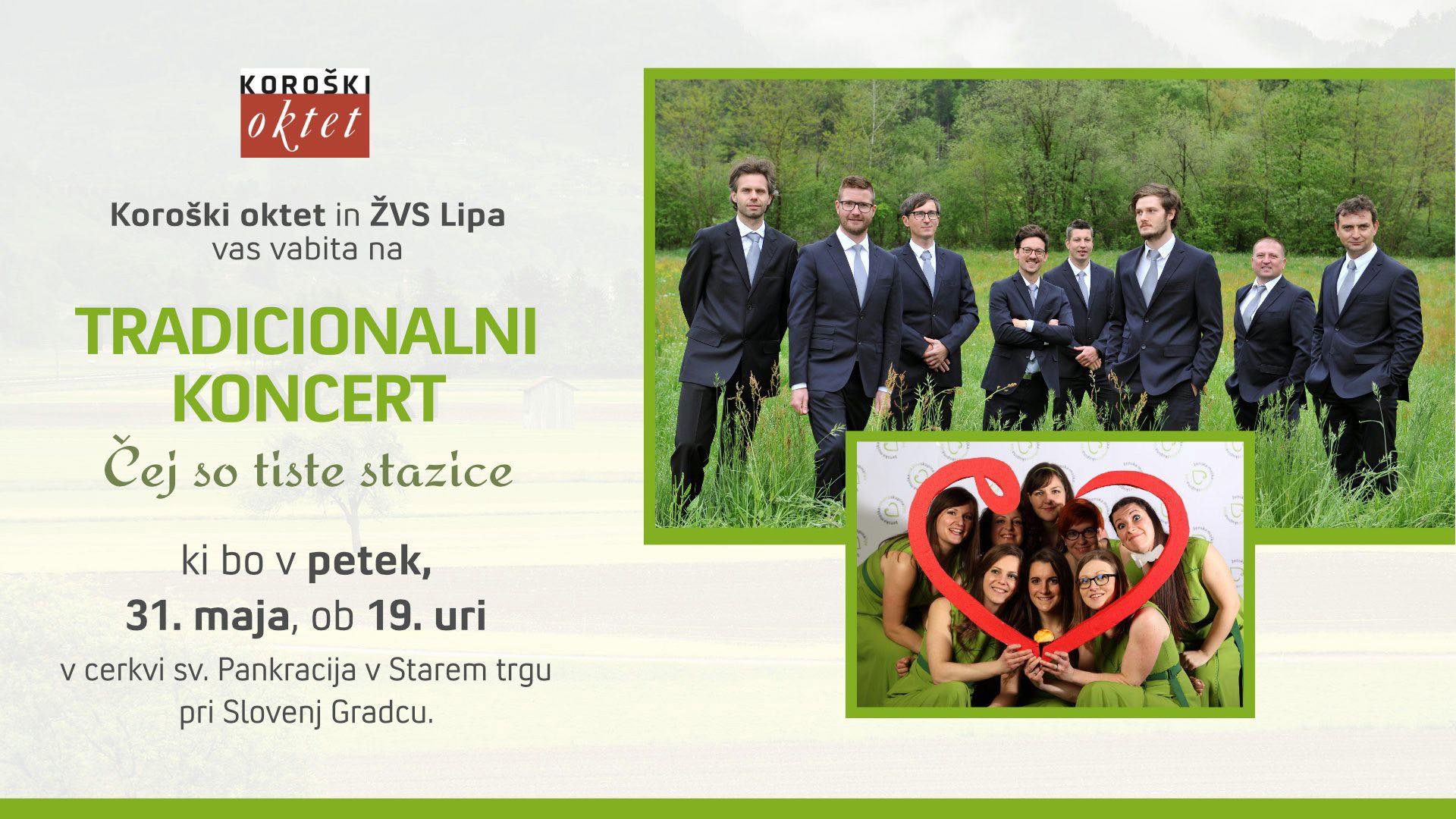 Koroški oktet in ŽVS Lipa vas vabita na tradicionalni koncert Čej so tiste stazice, ki bo v petek, 31. maja, ob 19. uri v cerkvi sv. Pankracija v Slovenj Gradcu.