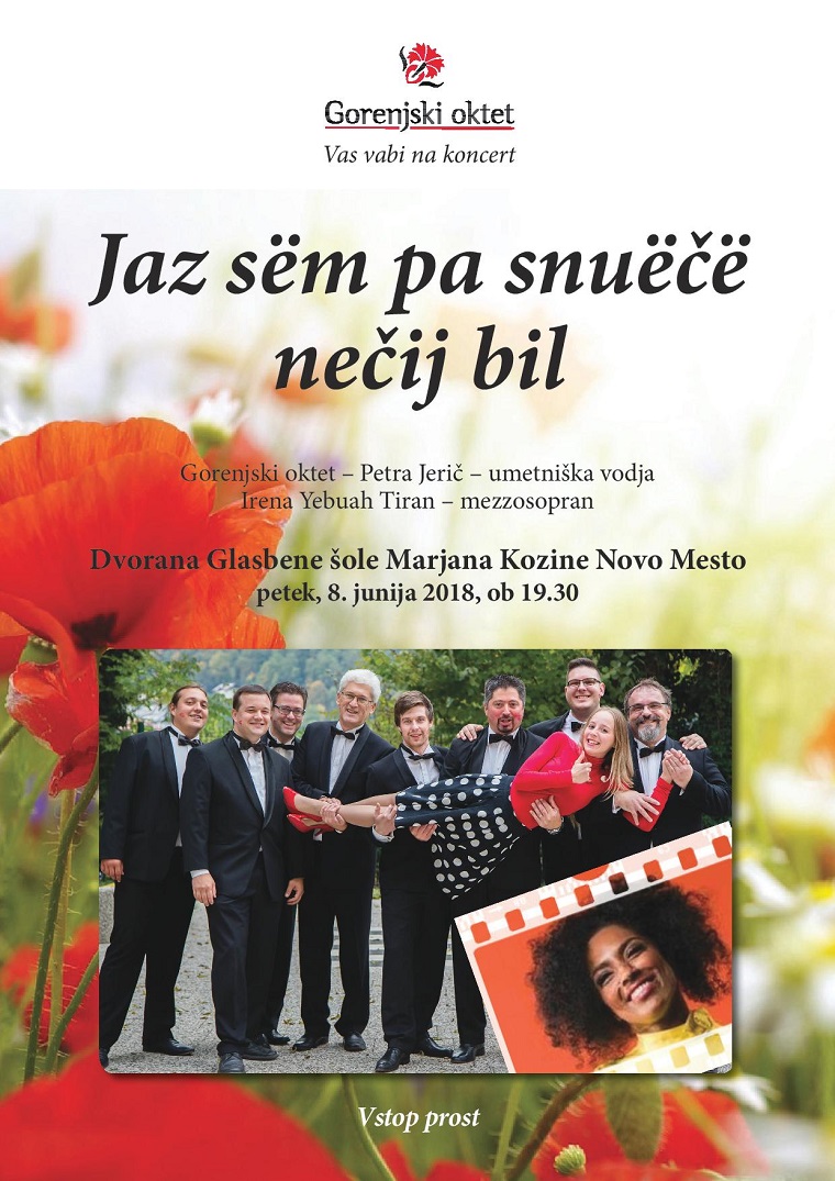 Pevci Gorenjskega okteta vas z umetniško vodjo Petro Jerič, vabimo da skupaj z nami zaključimo uspešno pevsko sezono s koncertom Jaz sëm pa snuëčë nečij bil. Na odru se nam bo pridružila vrhunska mezzosopranistka Irena Yebuah Tiran. Zazvenela bodo dela Hrabroslava Volariča, Antona Foersterja, Emila Adamiča, Ambroža Čopija, Andreja Makorja, Tineta Beca, Ola Gjeila in Gene Pitneya, tako da bo vsak poslušalec našel nekaj za sebe.