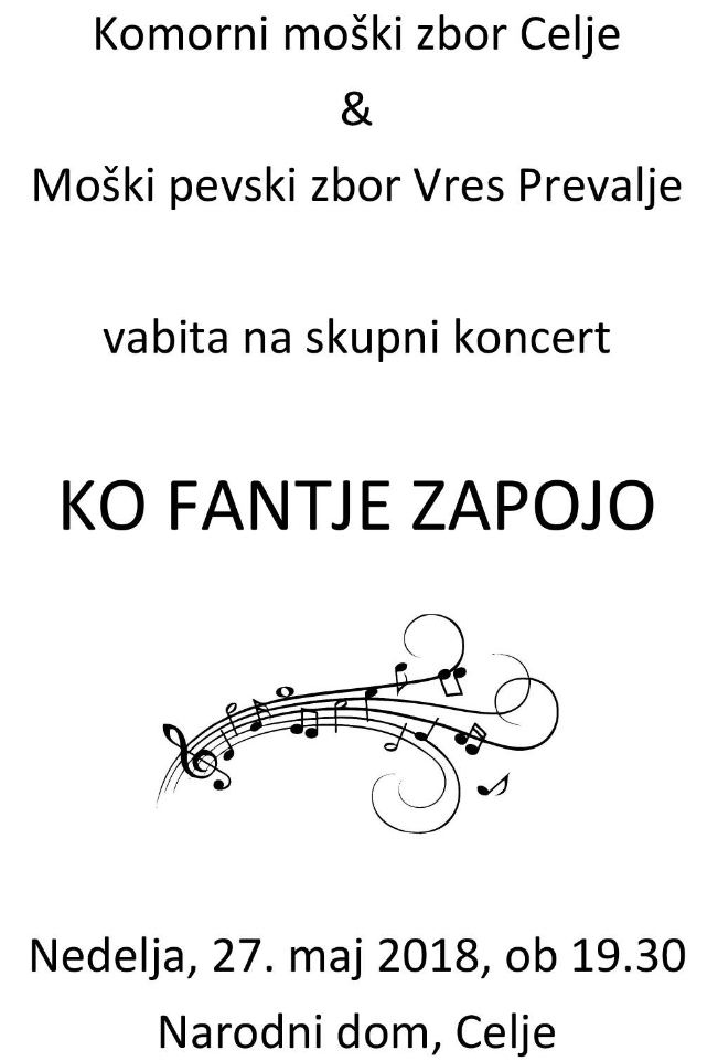 To nedeljo, 27. maja, Komorni moški zbor Celje gosti pevce Moškega zbora Vres Prevalje. Sodelovanje se je začelo pred nekaj leti, ko so bili pevci Komornega moškega zbora povabljeni v goste v Slovenj Gradec, kjer so skupaj s Korošci izvedli božični koncert. Tokrat so gostitelji Celjani, ki se pripravljajo na gostovanje v Singnu, kjer se bo sredi junija obeležila 30-letnica pobratenja občin Celje in Singen, Prevaljčani pa se čez teden dni odpravljajo na mednarodno zborovsko tekmovanje Lege Artis v Tuzli v Bosni.