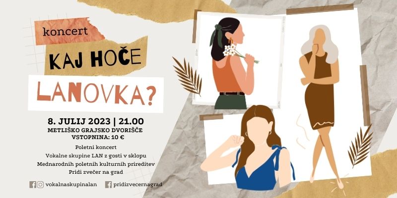 Vokalna skupina Lan pripravlja poletni koncert v okviru Mednarodnih poletnih kulturnih prireditev Pridi zvečer na grad. Repertoar, ki bo žensko obarvan, nas bo vodil do odgovorov na vprašanje, kaj pravzaprav hočemo deklice, dekleta, žene, pevke, lanovke. Z nami bosta nastopila tudi OPZ Lan in glasbena skupina Marjana Končarja.