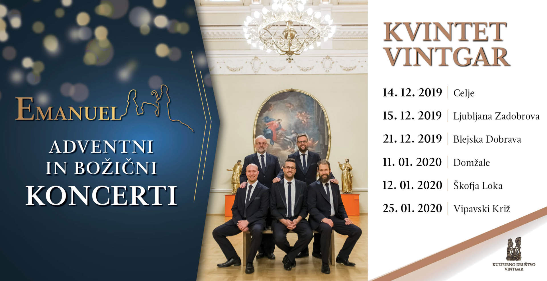 Kvintet Vintgar v preteklem adventnem in še vedno aktualnem božičnem času izvaja koncerte po slovenskih cerkvah s skupnim naslovom “Emanuel”. Tri dogodke so že izvedli v decembru (Celje, Ljubljana Zadobrova in Blejska Dobrava), trije še sledijo v januarju in sicer:
