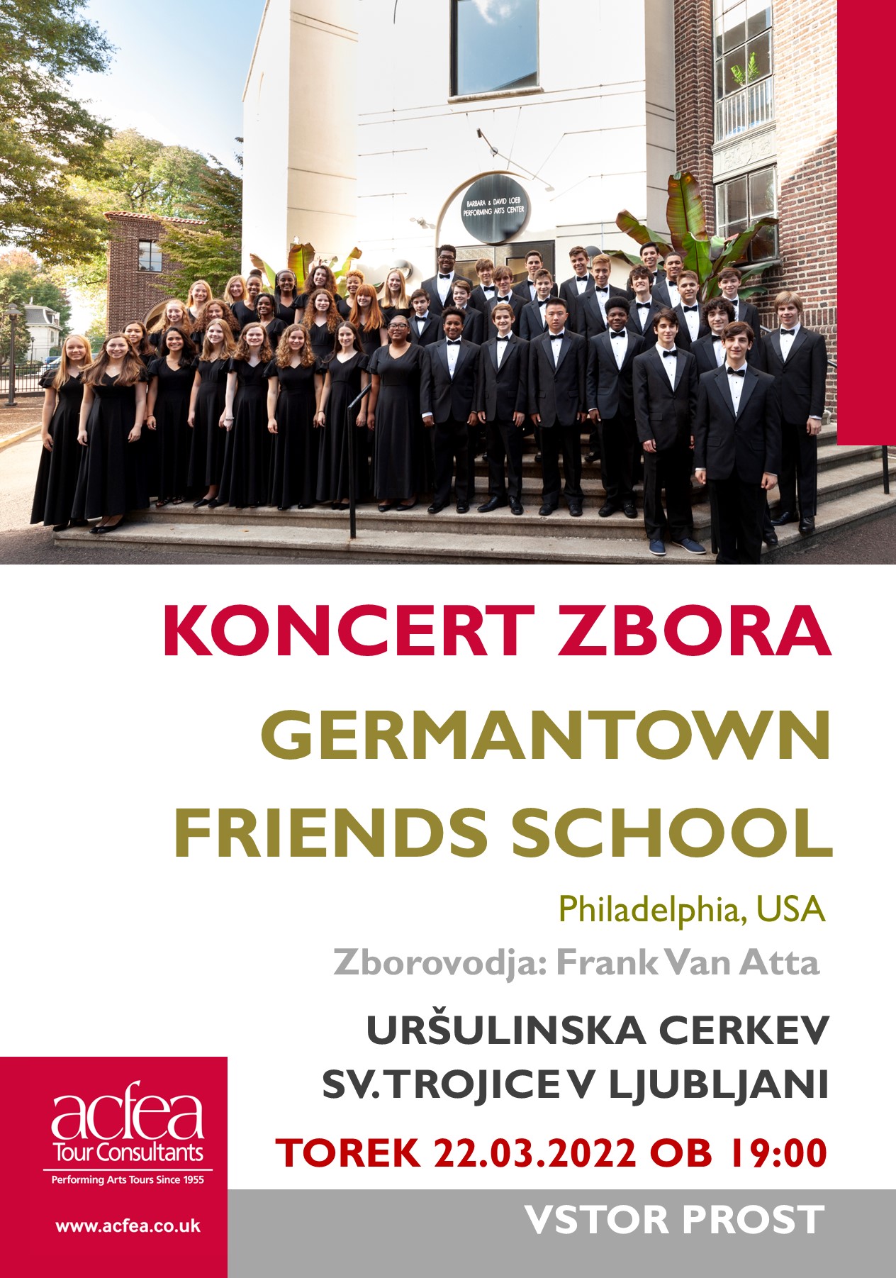 Vljudno vabljeni na koncert Mladinskega pevskega zbora Germantown Friends School iz Filadelfije v ZDA. Pod umetniškim vodstvom zborovodja Franka van Atta bo zbor izvedel sakralna dela od renesanse do danes, s posebnim poudarkom na skladbah ameriških skladateljev.