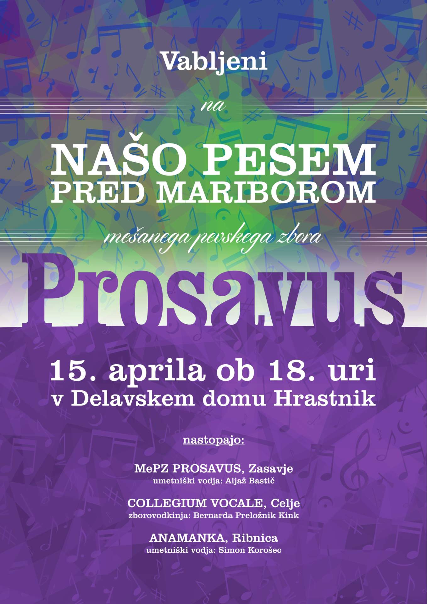 V nedeljo, 15. aprila 2018 bo ob 18.00 v Delavskem domu Hrastnik koncert z naslovom Naša pesem pred Mariborom. Predstavili se bodo trije pevski sestavi, ki bodo teden dni kasneje nastopili na 15. državnem tekmovanju pevskih zborov Naša pesem v Mariboru. Nastopili bodo: