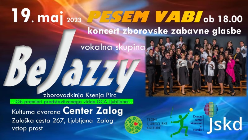 Kulturna dvorana Center Zalog 19. maj 2023 ob 18.uri. Vstop prost. Vabilo v prilogi. S koncertom PESEM VABI ponujajo pevci vokalne skupine BeJazzy za vsakogar nekaj. Vsem znane zimzelene melodije očarajo s svojimi poetskimi besedili in večnimi melodijami, nekaj bo šaljivih napevov, z ljudsko pesmijo v modernejši vokalni preobleki pa se dotaknemo tudi slovenskega izročila. Seveda – manjkalo ne bo jazzovskih standardov, ki prepevajo o večnem iskanju prave ljubezni tako v baladah kot v igrivih pesmih v ritmu swinga. Za trenutek bomo skočili tudi v latino vode in se pozibavali v ritmu sambe. Vse, se ve, acapella. Za ubranost glasov in usklajenost ritma pevk in pevcev BeJazzy skrbi zborovodkinja Ksenja Pirc.