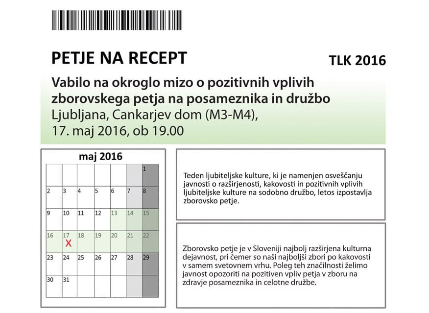 Javni sklad RS za kulturne dejavnosti (JSKD) pripravlja v Tednu ljubiteljske kulture (TLK) v torek, 17. 5. 2016, ob 19.00 v Cankarjevem domu okroglo mizo in razpravo na temo pozitivnih vplivov petja v zboru ali skupini na zdravje posameznikov, njihovo počutje in dobrobit celotne družbe. Na njej bodo sodelovali Monika Weise, univ. dipl. socialna delavka in glasbena terapevtka, predstavnica mreže pojočih bolnic (Singing Hospitals) iz Nemčije, dr. Katarina Habe, doc. dr. psihologije in pevka, Damjana Zupan, profesorica klavirja, ISSTIP terapevtka glasbene medicine in vodja delavnic na temo nastopanja ter Blaž Rojko, univ. dipl. socialni delavec, zborovodja in skladatelj. Navzoče bosta nagovorila tudi mag. Igor Teršar, direktor JSKD, in Mihela Jagodic, samostojna strokovna svetovalka za vokalno glasbo pri JSKD.