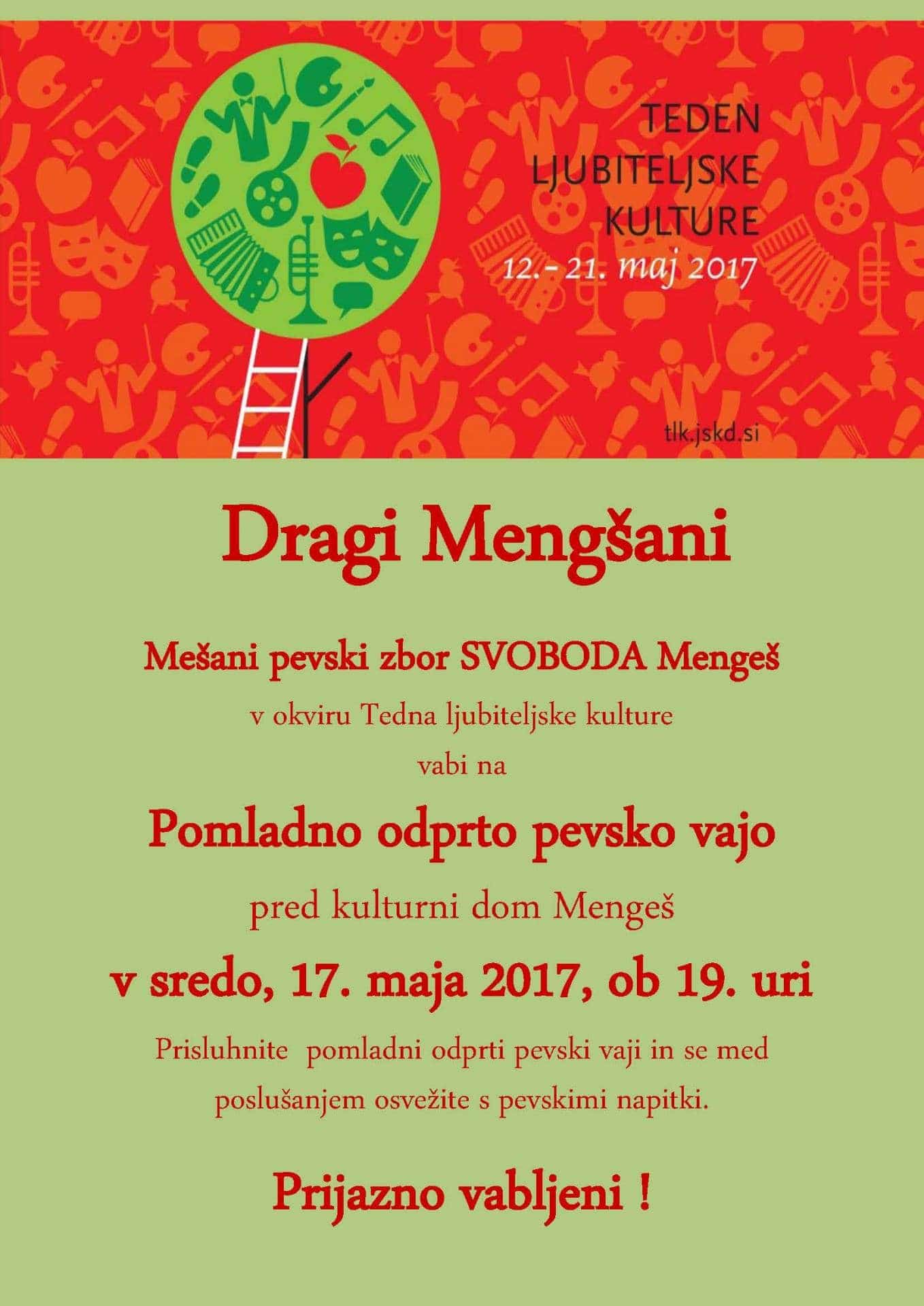 Mešani pevski zbor Svoboda Mengeš organizira v Tednu ljubiteljske kulture pomladno odprto pevsko vajo v sredo, 17. maja 2017, ob 19.uri pred Kulturnim domom v Mengšu. Vabimo prijatelje zbora na pokušino učenja novih pesmi in na zborovske napitke.