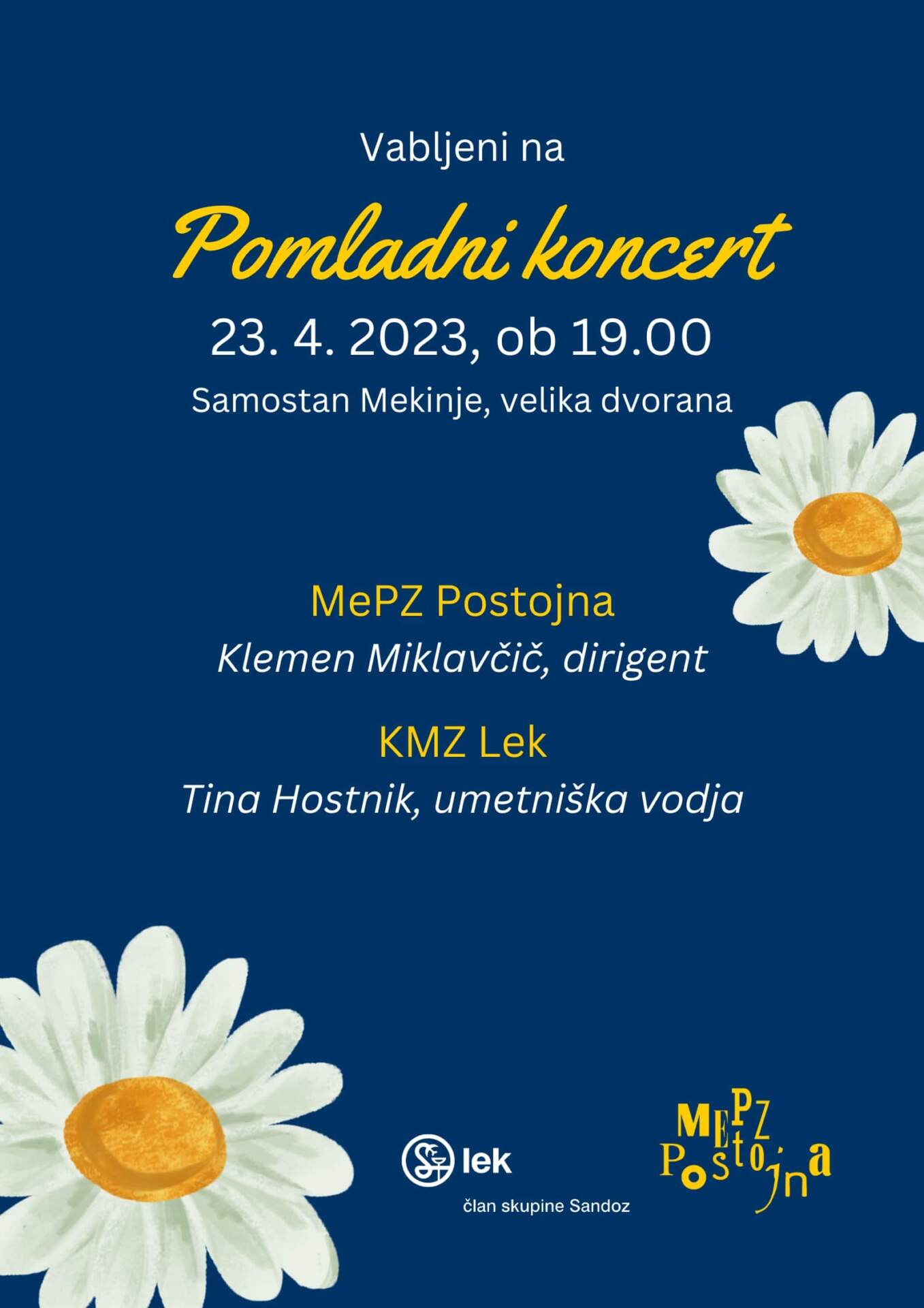 Pevci Mešanega pevskega zbora Postojna in Komornega moškega zbora Lek združujemo moči, ter vas prisrčno vabimo na spomladanski koncert z zanimivim slovensko-evropskim programom. Dobrodošli v prijetni ambient velike dvorane samostana Mekinje, vstop na koncert je prost.