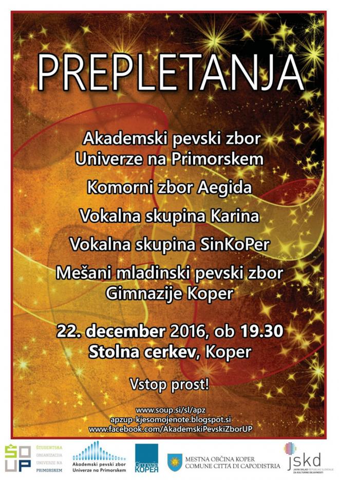 Koncert Prepletanja, združuje zasedbe, ki so na nek način povezane z APZ UP-jem (Komorni zbor Aegida, Vokalna skupina Karina, Vokalna skupina Sinkoper, MeMPZ Gimnazije Koper, APZ UP). December je namreč čas, ko se prijatelji med seboj obdarujejo in izrečejo lepe želje. Za pevce in pevke APZ UP pa bo največje darilo to, da skupaj zapojejo, prepletejo glasbene pripovedi z bodočo, zdajšnjo in preteklo generacijo.