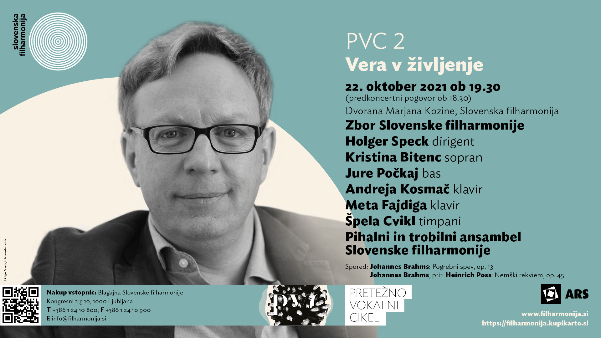Johannes Brahms, skladatelj simfonij, koncertov, variacij in komorne glasbe, s katerimi je v razvitem klasicističnem glasbenem jeziku in miselnem redu tako pomembno določal in potrjeval glasbo druge polovice 19. stoletja, je bil vse svoje življenje povezan tudi s človeškim glasom. Na drugem koncertu Pretežno vokalnega cikla nam bo Zbor Slovenske filharmonije pod vodstvom nemškega dirigenta Holgerja Specka poustvaril njegovi obsežnejši deli: Pogrebni spev in Nemški rekviem. Speck, ki ga ameriški Fanfare Magazine opisuje kot »nesporno avtoriteto«, slovi po živih, globokih in neposrednih izvedbah. V njih se poslužuje slogovno ustreznih izvajalskih načinov, pri čemer se opira tako na poznavanje zgodovinskega konteksta kakor na svoj izostreni čut za zvočnost. Na petkovem koncertu se bodo izvajalcem na odru kot solisti pridružili še: sopranistka Kristina Bitenc, baritonist Jure Počkaj, pianistki Andreja Kosmač in Meta Fajdiga, timpanistka Špela Cvikl Flis ter Pihalni in trobilni ansambel Slovenske filharmonije.