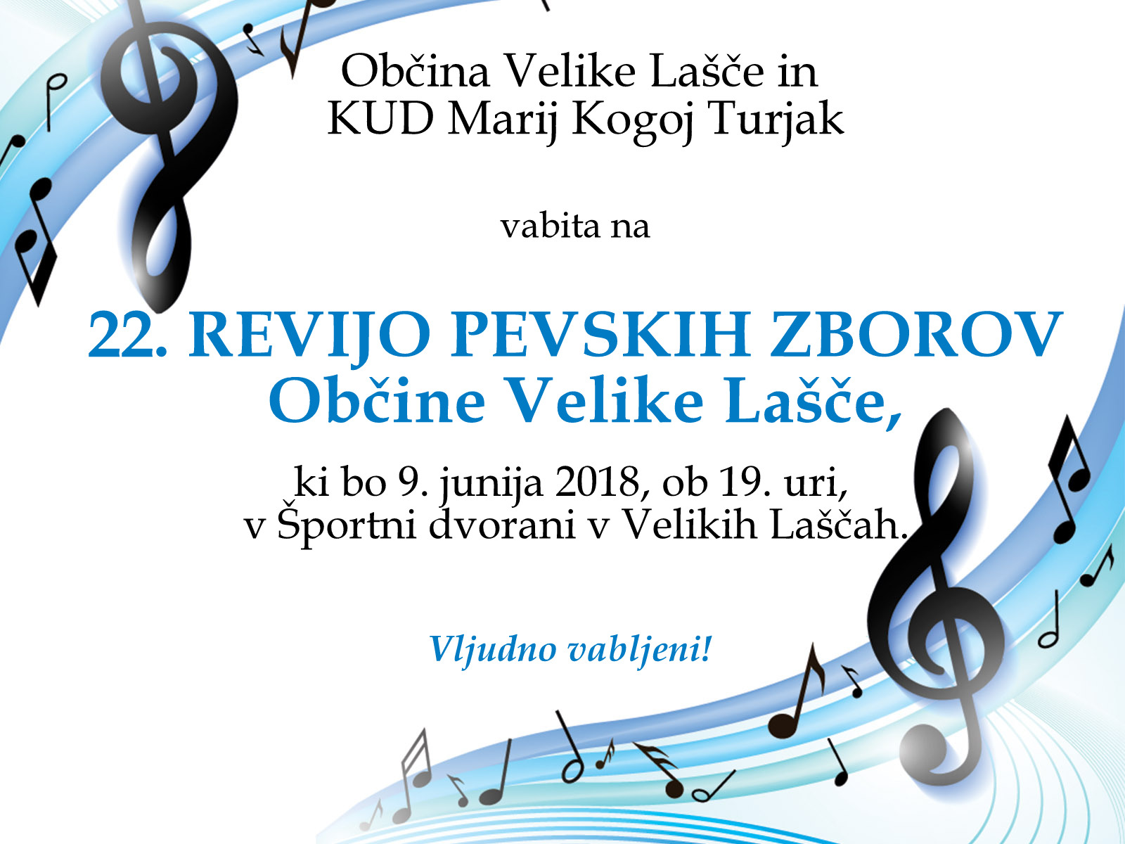 KUD Marij Kogoj Turjak v sodelovanju z Občino Velike Lašče tokrat že 22. prireja Revijo pevskih zborov, na kateri se predstavijo domači in gostujoči pevski zbori in komorne zasedbe. Na letošnji reviji bomo lahko slišali 8 domačih zborov in 2 povabljena, ki delujeta v občini Ribnica. To so: