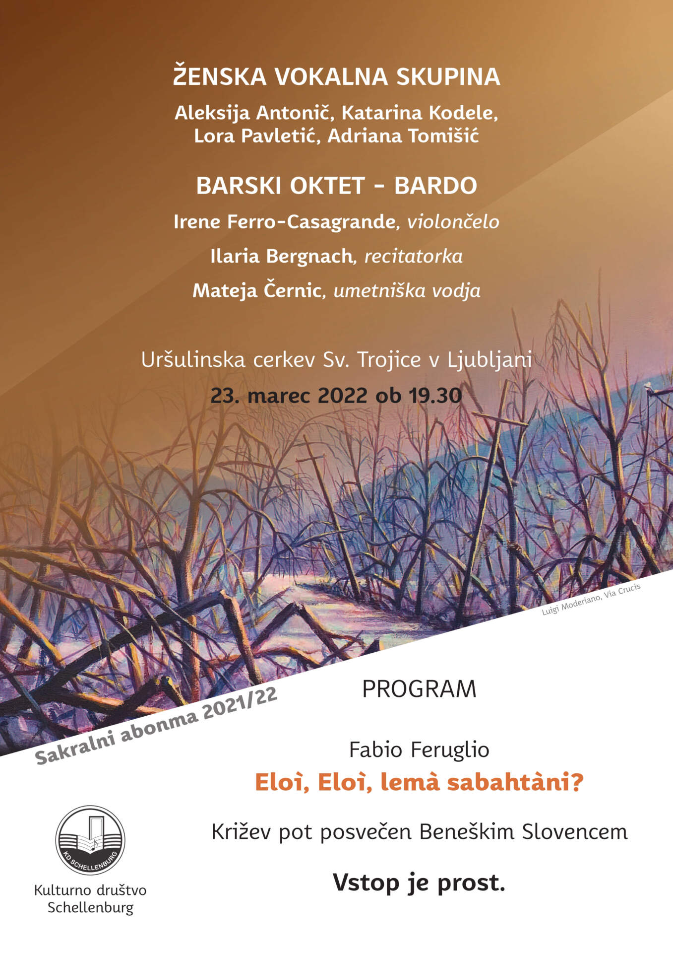 Vljudno vabljeni na koncert Sakralnega abonmaja, na katerem bomo prisluhnili križevemu potu posvečenemu Beneškim Slovencem, ki so ga ustvarili rojaki iz zamejstva. Križev pot sestavljajo slike Luigia Moderiana iz Plestišč, meditacije duhovnika Renza Calligara iz Barda ter glasba skladatelja Fabia Feruglia. Križev pot z naslovom Eloì, eloì, lemà sabahtàni bodo v Ljubljani prvič izvedli Ženska vokalna skupina iz Gorice, Barski oktet iz Barda, violončelistka Irene Ferro-Casagrande in recitatorka Ilaria Bergnach. Umetniška vodja in dirigentka bo Mateja Černic.