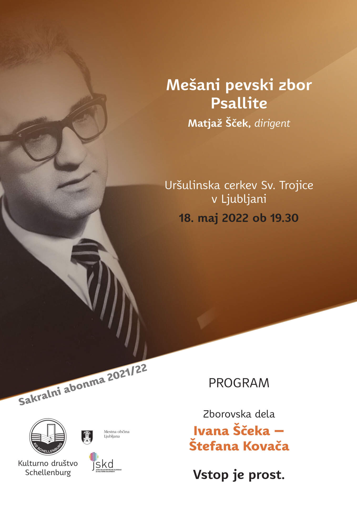 Vljudno vas vabimo na koncert Sakralnega abonmaja, na katerem bomo prisluhnili glasbi primorskega skladatelja Ivana Ščeka, ob letošnji 50. obletnici skladateljeve smrti. Mešani pevski zbor Psallite pod vodstvom dirigenta Matjaža Ščeka, bo izvedel Slovensko velikonočno mašo Kristus je vstal ter zborovske skladbe različnih obdobij cerkvenega leta, ki jih je skladatelj podpisoval s psevdonimom Štefan Kovač.
