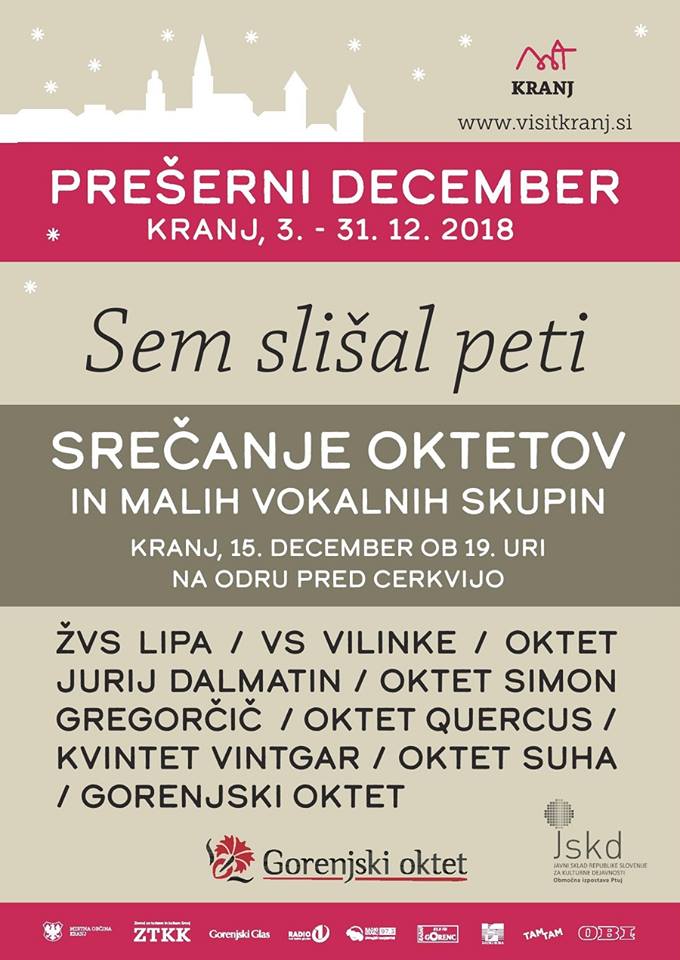 Pevci Gorenjskega okteta Vas vabimo na Srečanje oktetov in malih vokalnih skupin Sem slišal peti na Glavnem trgu v Kranju, 15.decembra, ob 19:00.