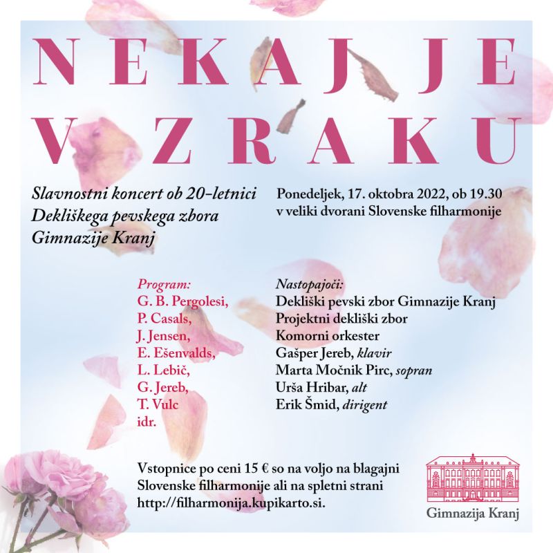 Koncert smo naslovili z verzom iz Pavčkove pesmi Nekaj je v zraku, ki bo med drugim v čudoviti uglasbitvi Lojzeta Lebiča zazvenela na koncertu. Poleg omenjenega bosta na sporedu tudi Pergolesijeva Stabat mater ter cvetober skladb za ženske zbore v a cappella izvedbi ter ob spremljavi klavirja. Koncertni večer bo poklon bogati dvajsetletni zgodovini našega zbora, okronani s številnimi uspehi tako na koncertnih kot tekmovalnih odrih doma in v tujini, na njem pa bo poleg aktualne zasedbe Dekliškega pevskega zbora Gimnazije Kranj nastopil tudi projektni zbor, sestavljen iz nekdanjih pevk vseh generacij. Na klavirju bo zbor spremljal pianist Gašper Jereb, pri izvedbi Pergolesijeve Stabat mater pa se bodo zboru pridružili pevski solistki Marta Močnik Pirc (sopran) in Urša Hribar (alt) ter baročni komorni orkester.