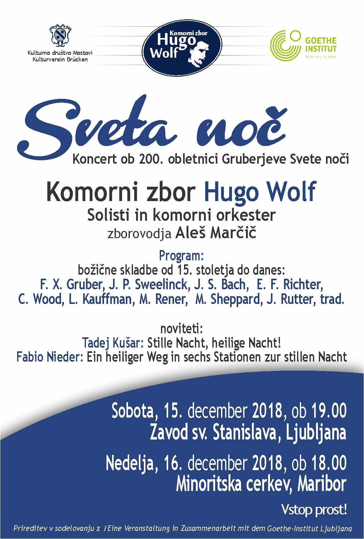 Ob 200. obletnici nastanka ene najbolj izvajanih božičnih skladb Sveta noč Komorni zbor Hugo Wolf s solisti in komornim orkestrom pripravlja božični koncert, na katerem bodo izvedli Gruberjeve rokopise Svete noči, najlepše božične skladbe iz svetovne zborovske zakladnice ter dve krstni izvedbi skladateljev Tadeja Kušarja in Fabia Niederja, napisani za to priložnost.