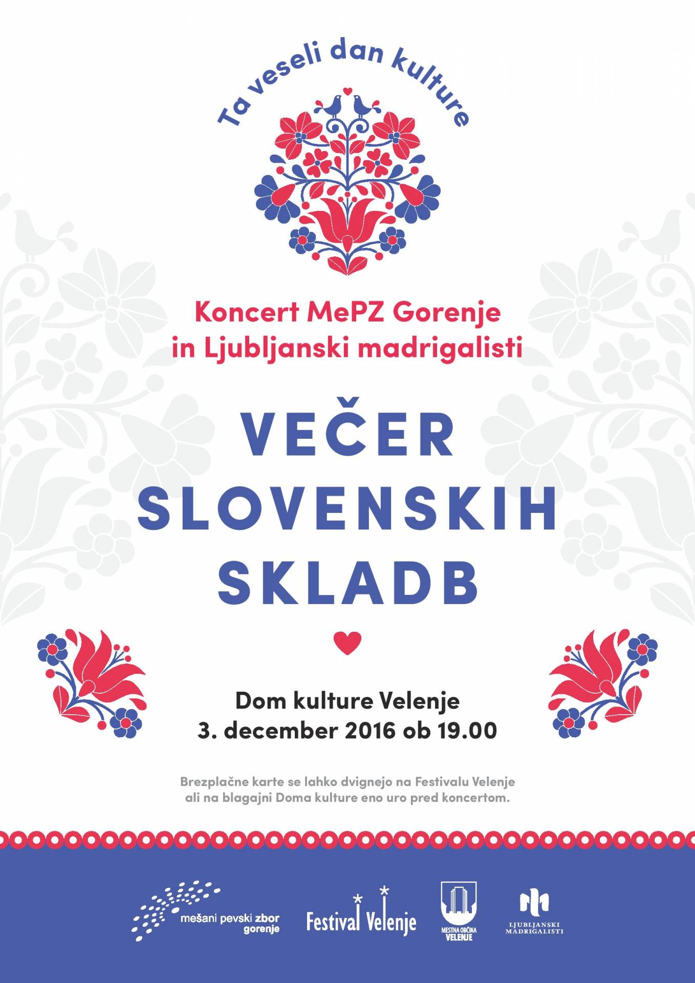 Ta veseli dan kulture bo 3. decembra v Domu Kulture v Velenju zaznamovan s premiernim druženjem Ljubljanskih madrigalistov in MePZ Gorenje. Vabljeni ob 19.00. Brezplačne vstopnice dvignete na blagajni.