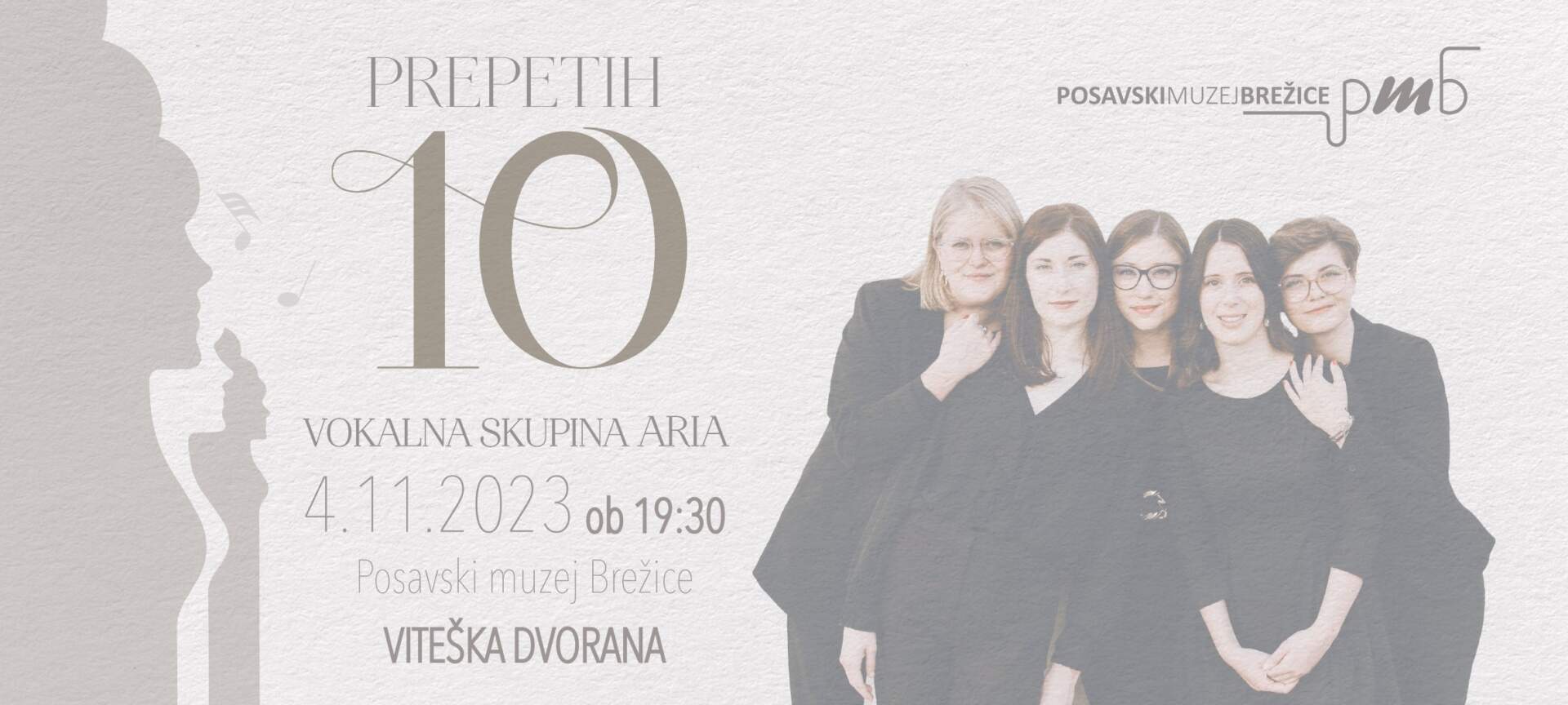 Toplo vabljeni na slavnostni koncert Vokalne skupine Aria z izbranimi glasbenimi gosti ob 10. obletnici delovanja, ki bo v soboto, 4. novembra 2023, ob 19.30, v čudoviti Viteški dvorani Posavskega muzeja Brežice.