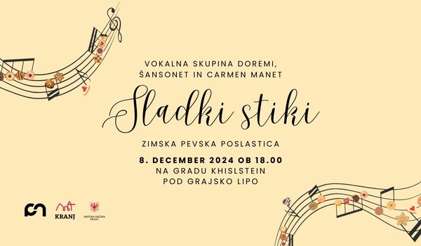 Sladki stiki, zimska pevska poslastica Dec 8 18:00 – 20:00 Kranj Sladki stiki, zimska pevska poslastica 15€