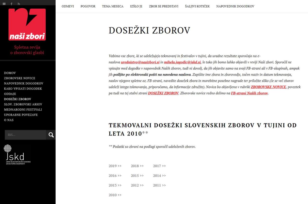 Ponovno vabimo vse zbore, ki se udeležujejo tekmovanj in festivalov v tujini, da uradne rezultate sporočajo na e-naslova urednistvo@nasizbori.si in mihela.jagodic@jskd.si, le tako jih bomo lahko objavili v reviji Naši zbori. Sporočil ne vpisujte med dogodke v napovednik Naših zborov, tudi ni dovolj, da jih objavite samo na svoji FB-strani ali v FB-skupinah, ampak jih pošljite po elektronski pošti na navedena naslova. Zapišite ime zbora in zborovodje, točen naziv in datum tekmovanja, naslov njegove spletne oz. FB-strani, navedite dosežek zbora in morebitne posebne nagrade ter priložite sliko (če se več zborov udeleži istega tekmovanja, priporočamo, da informacije združite).
