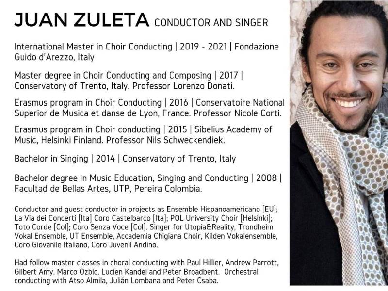 Če bi kateri zbor želel sodelovanja z zanimivim kolumbijskim dirigentom Juanom Zuleto, ki se je veliko izobraževal v Evropi in sodeloval z odličnimi zbori ter od letos živi v Ljubljani, vabljeni, da vzpostavite stik z njim: https://www.facebook.com/juan.d.zuleta.