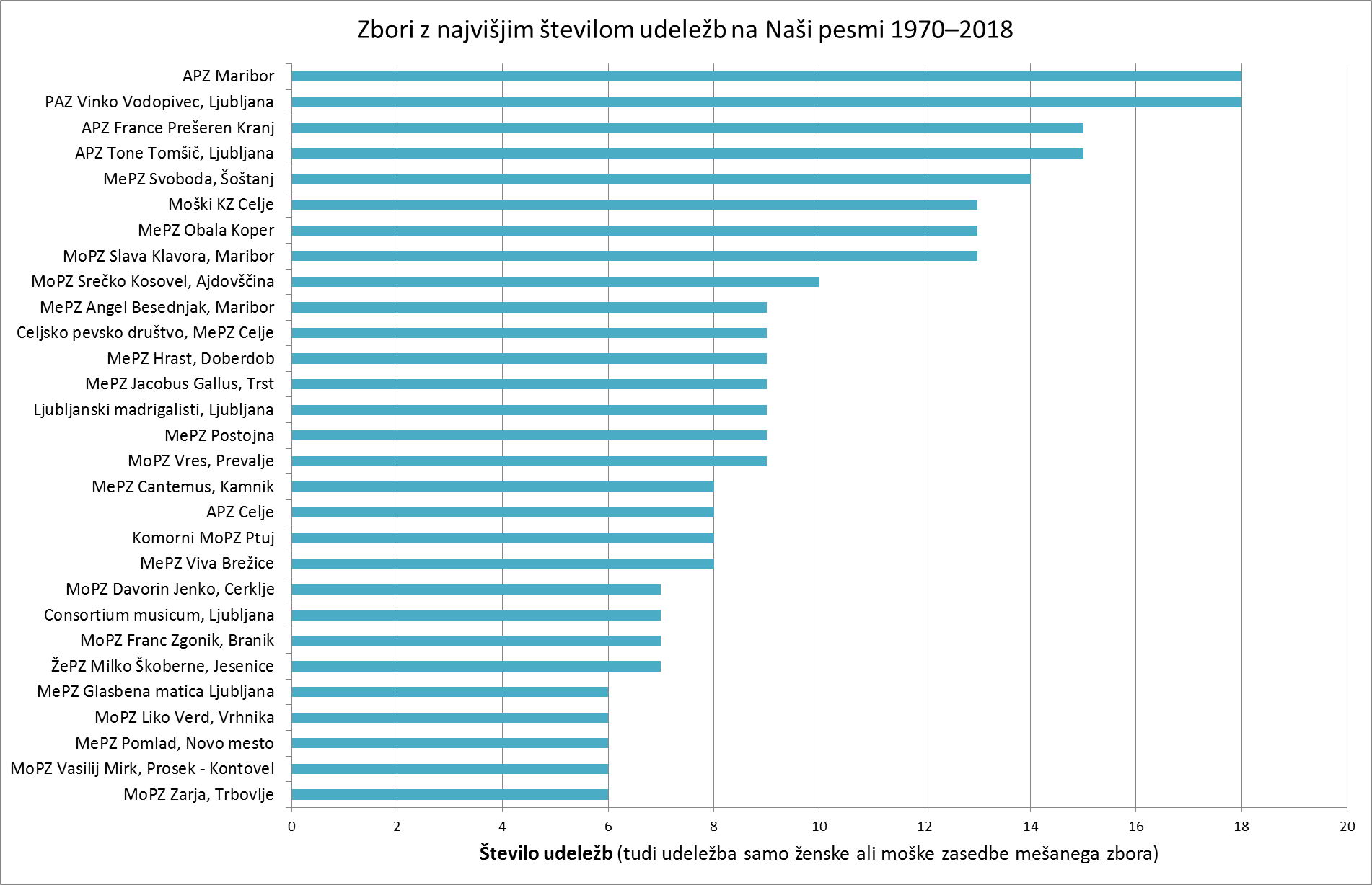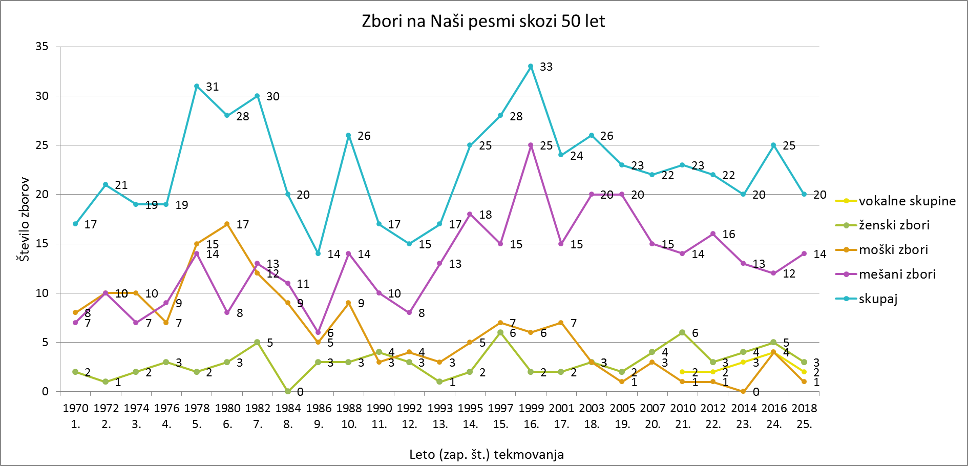 Od leta 1970 do 2018 je na Naši pesmi nastopilo 180 različnih zborov.* Od tega 36 ženskih, 37 moških in 98 mešanih, v obdobju od leta 2010 pa v ločeni kategoriji od 4 do 11 pevcev tudi 9 vokalnih skupin. Na posamezni prireditvi je tekmovalo od najmanj 14, leta 1986, pa vse do 33 zasedb v izjemno plodnem letu 1999.