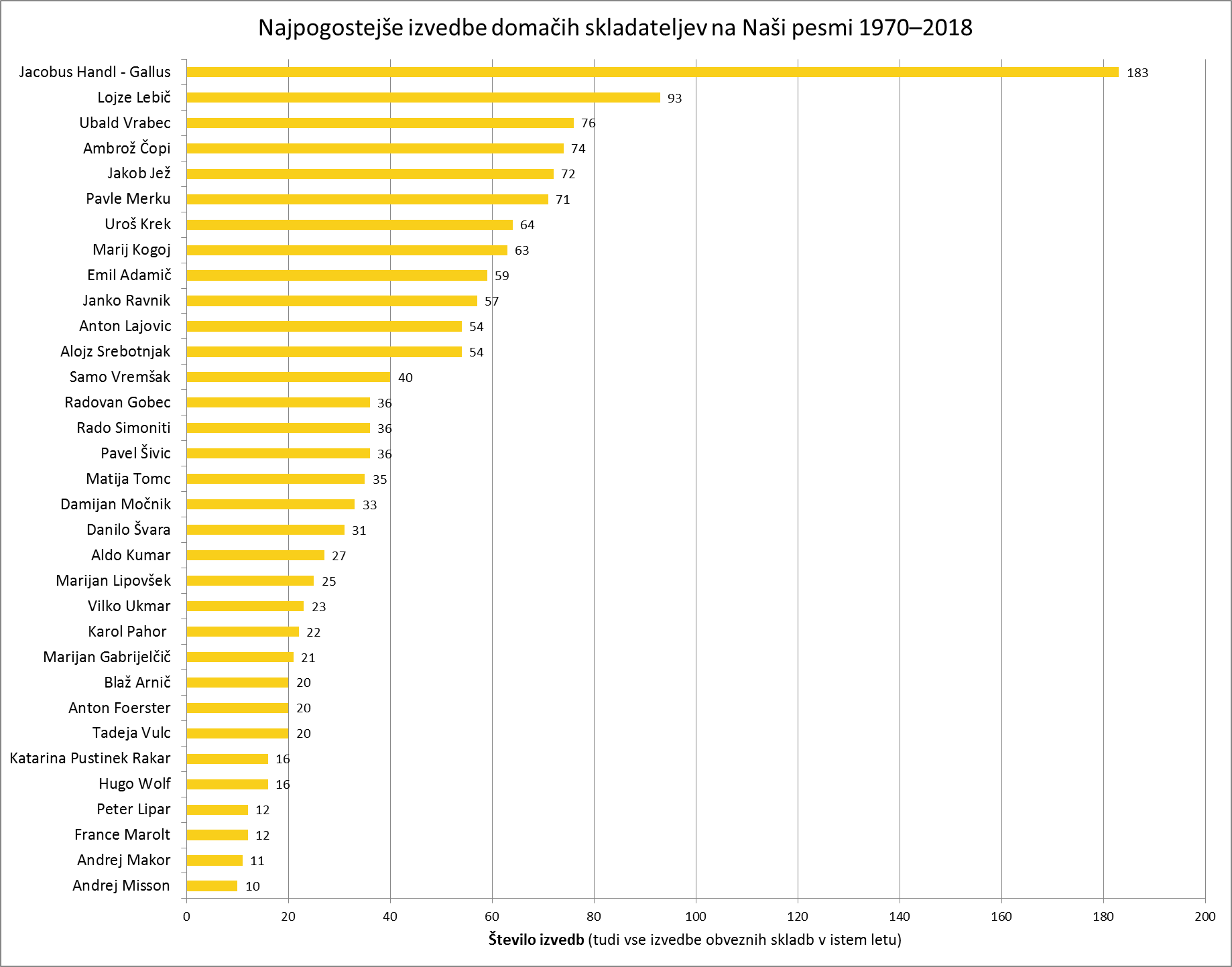 * Podatki na grafih do leta 2007 temeljijo na seznamih v jubilejnih zbornikih Naše pesmi: 15 Naših pesmi (1997), ur. Marko Studen, in 20 Naših pesmi (2007), ur. Mitja Gobec, Mihela Jagodic.