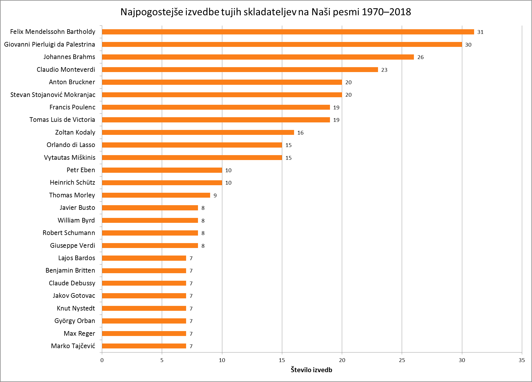 Polstoletna bera izvedenih skladb na Naši pesmi gotovo skriva v sebi marsikaj zanimivega, posebej v povezavi z razpisovanjem obveznih skladb in njihovim vplivom na siceršnje repertoarje pevskih zborov. Na tem mestu takšne analize nismo naredili. Iz prikaza izvajanih domačih in tujih skladateljev pa je razvidna precejšnja raznovrstnost in rahla težnja k sodobnejšim kompozicijam. Daleč pred vsemi pa je Gallus, ki mu je upravičeno posvečeno obeležje v preddverju Unionske dvorane.