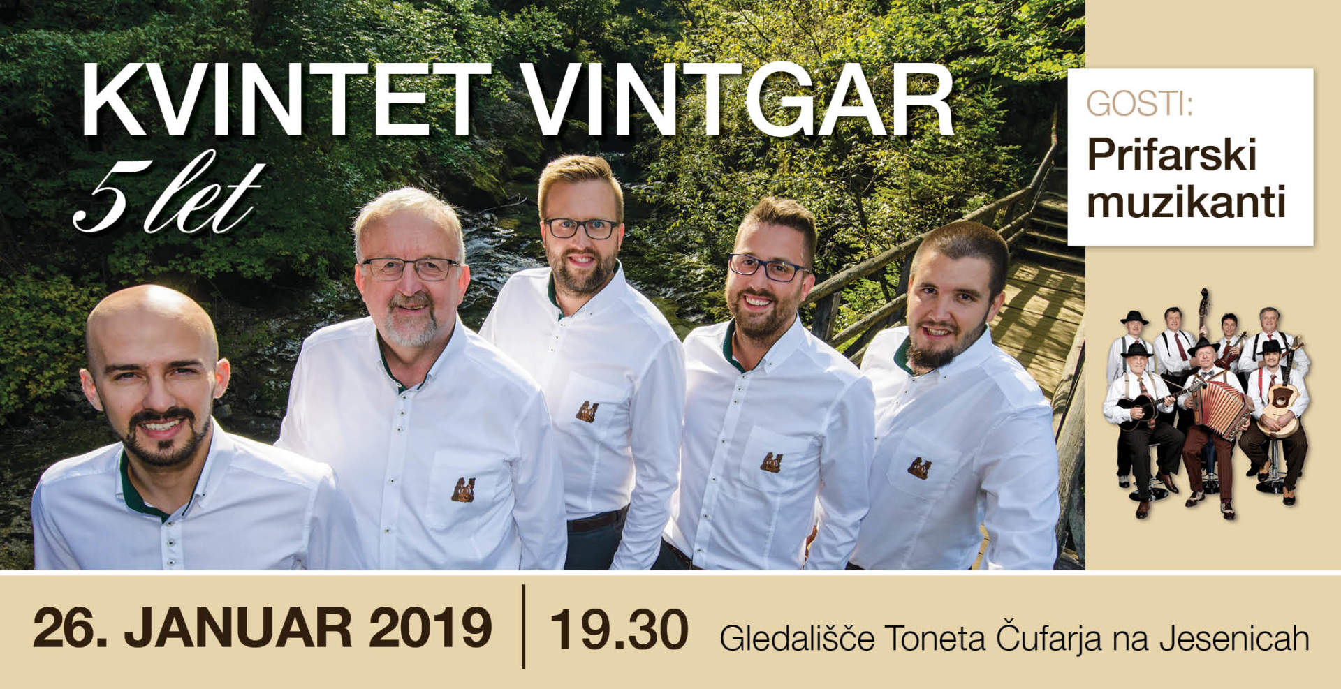 Kinodvorana Gledališča Toneta Čufarja Trg Toneta Čufarja 4,Jesenice,Gorenjska,SloveniaPrvo petletje člani Kvinteta Vintgar obeležujemo s slavnostnim koncertom, ki bo 26. januarja 2019…