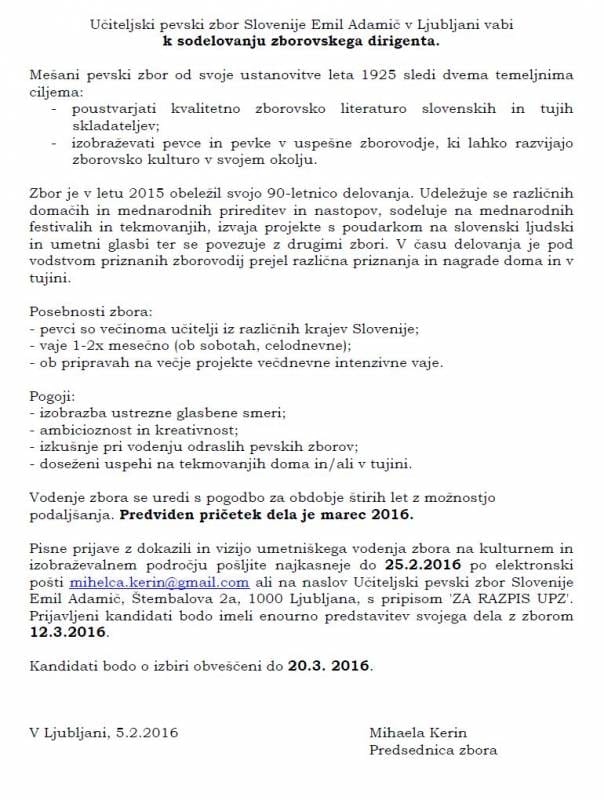 Učiteljski pevski zbor Slovenije Emil Adamič vabi k sodelovanju zborovskega dirigenta za obdobje štirih let z možnostjo podaljšanja. Predviden začetek: marec 2016. Pisne prijave pošljite do 25. 2. 2016 na mihelca.kerin@gmail.com ali na naslov UPZ Slovenije Emil Adamič, Štembalova 2a, 1000 Ljubljana, s pripisom ‘ZA RAZPIS UPZ’. Podrobnosti spodaj:
