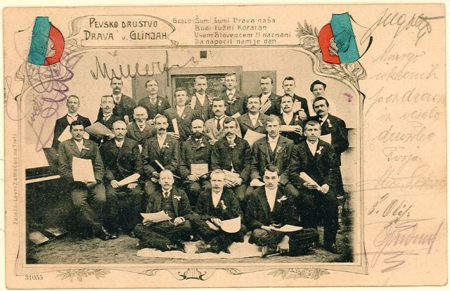 Koroški pevski zbor »Drava« v Glinjah je dobil ime po tamkajšnji priljubljeni reki. Na razglednici pa je objavil tudi društveno geslo.